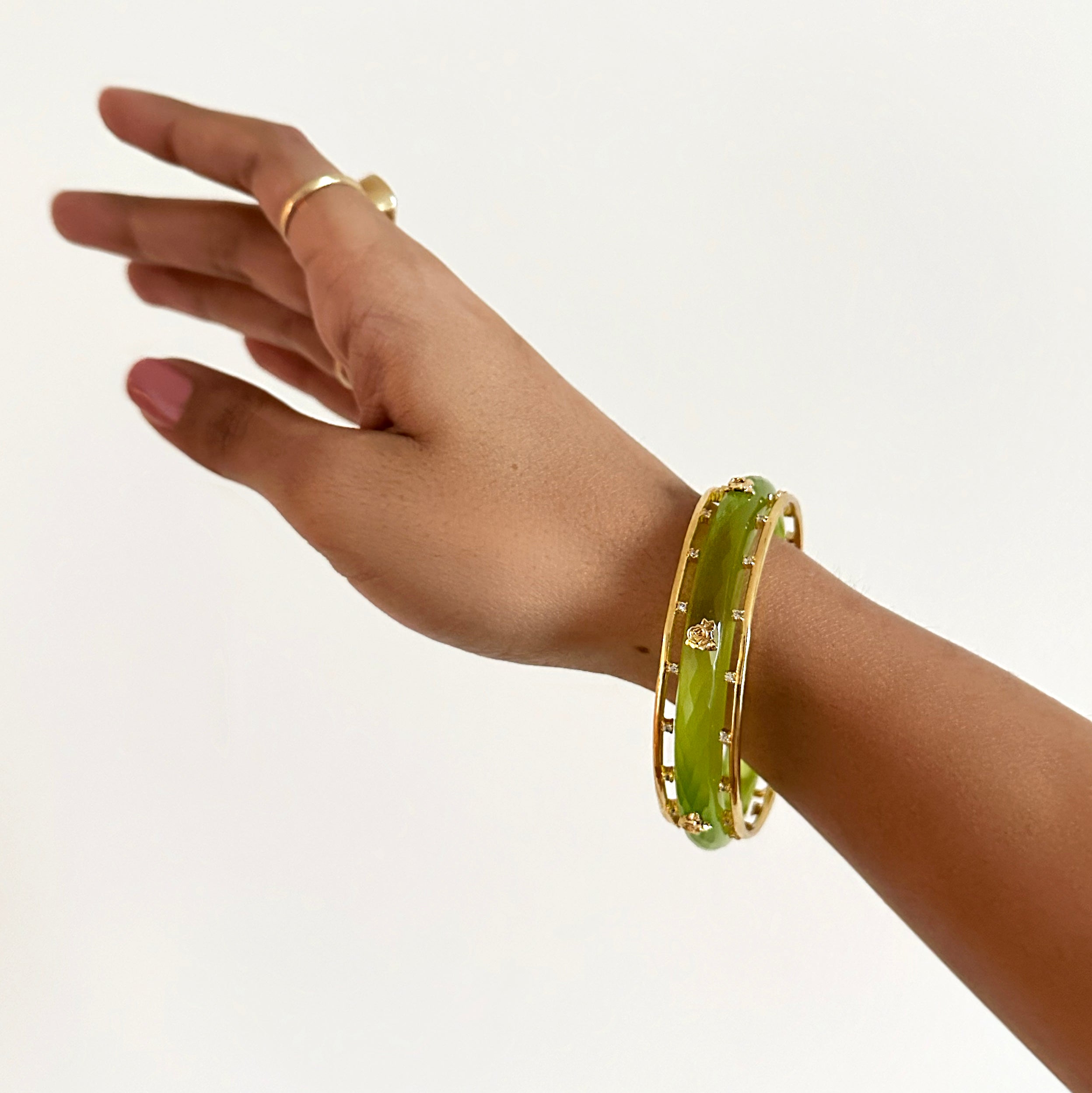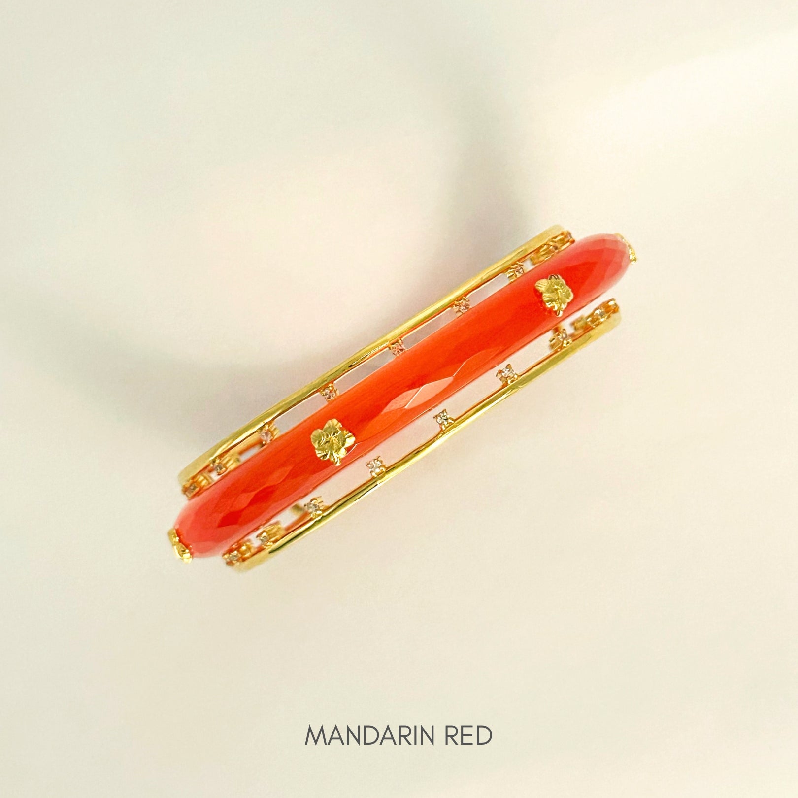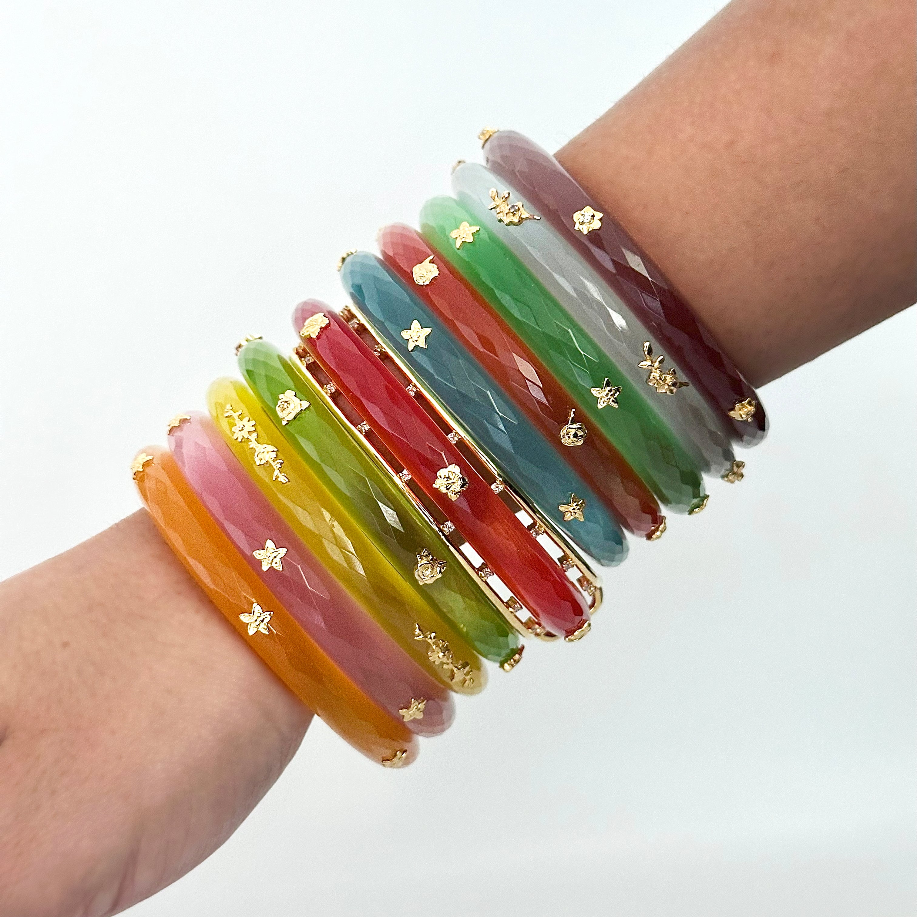 The Hanataba (meaning Flower Bouquet) Bangles are a vibrant celebration of color and elegance. This collection features ten crystal Belgian bangles in radiant hues, designed to capture the joy and beauty of a flower bouquet. Each bangle shines with brilliance, perfect for adding a touch of sparkle to any occasion. The set comes with a sterling silver frame adorned with white Swarovski stones, crafted in a free-size design that is easily detachable. The versatile frame allows the bangles to be worn in two ways, sleek and colorful on their own or elevated with the decadent 22kt gold plating with shimmering silver accent—making them timeless, versatile, and effortlessly stylish.